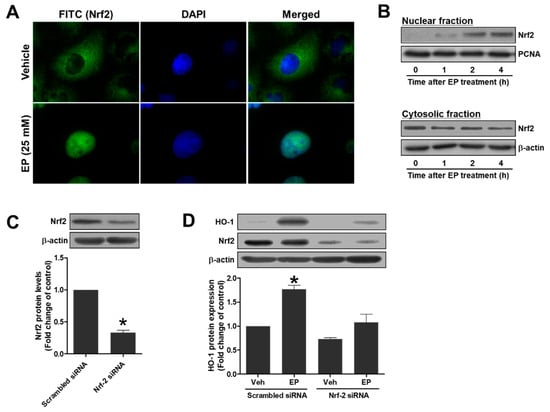 EP induces HO-1 protein expression through Nrf2 activation in HK-2 cells. (A) Cells were treated with EP (25 mM) for 4 h and subjected to immunofluorescence staining (Nrf2, green; nuclei, blue). (B) Cells were treated with EP (25 mM) for indicated times (0–4 h), and nuclear and cytosolic fractions were separated for western blot analysis. (C) Cells were transfected with scrambled or Nrf2-specific siRNA and Nrf2 protein levels were determined by western blot analysis. (D) Cells were transfected with scrambled or Nrf2-specific siRNA, and treated with vehicle or EP (25 mM) for 24 h. HO-1 and Nrf2 protein levels were determined by western blot analysis. Representative western blots and the quantification were shown. Data are presented as the mean ± SEM. * p <0.05 vs. Scrambled siRNA control.