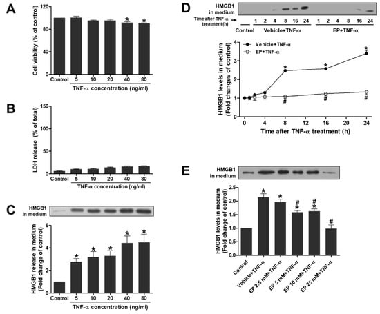 EP inhibits the active secretion of HMGB1 stimulated by TNF-α in HK-2 cells. (A,B) Cells were treated with TNF-α at indicated concentrations (0–80 ng/mL) for 24 h and subjected to MTT or LDH assay. (C) HMGB1 protein levels in media were determined by western blot analysis. (D) Cells were pretreated with EP (25 mM) for 1 h, and then treated with TNF-α (10 ng/mL) for indicated times (1–24 h). The HMGB1 protein levels in media were determined by western blot analysis. (E) Cells were pretreated with EP at indicated concentrations (0–25 mM) for 1 h, and then treated with TNF-α (10 ng/mL) for 24 h. The HMGB1 protein levels in media were determined by western blot analysis. Representative western blots and the quantification were shown. Data are presented as the mean ± SEM. * p < 0.05 vs. Veh control, # p < 0.05 vs. Veh + TNF-α.