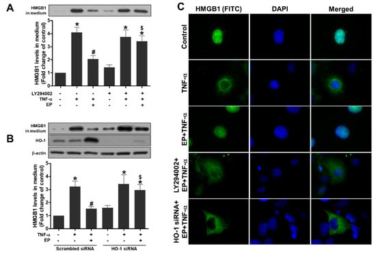 PI3K/Akt and HO-1 induction is required for EP to inhibit the HMGB1 secretion in TNF-α-treated HK-2 cells. (A) Cells were pretreated with LY294002 (10 µM) for 30 min, and with EP (25 mM) for 1 h, then were treated with TNF-α (10 ng/mL) for 24 h. (B) Cells were transfected with scrambled or HO-1-specific siRNA, and treated with EP (25 mM) for 1 h, then were incubated with TNF-α (10 ng/mL) for 24 h. The HMGB1 or HO-1 protein levels in media were determined by Western blot analysis. Representative western blots and the quantification were shown. Data are presented as the mean ± SEM. * p < 0.05 vs. Veh (or Scrambled siRNA) control, # p < 0.05 vs. Veh + TNF-α, $ p < 0.05 vs. EP + TNF-α. (C) Representative images of HMGB1 immunofluorescence staining were shown (HMGB1, green; nuclei, blue).