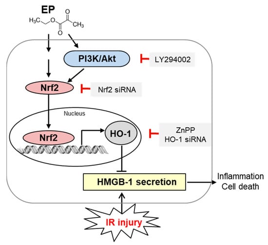 A proposed molecular mechanism of EP that protects the kidney against renal IR injury. EP inhibits the active secretion of HMGB1 from proximal tubular cells during IR injury through HO-1 induction. HO-1 is a cytoprotective enzyme that reduces plasma HMGB-1 followed by tubular inflammation and cell death. EP activates PI3K/Akt and Nrf2 pathway to induce HO-1 expression; LY294002, Nrf2 or HO-1 siRNA, and ZnPP were used to block each signaling molecule/pathway as indicated, to study the mechanism of EP in this study.