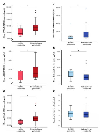 Levels of inflammatory mediators in serum and saliva samples. Mean (±SD) serum concentrations of APRIL/TNFSF13 (A), sCD30/TNFRSF8 (B) and gp130/sIL-6Rß (C); mean (±SD) saliva concentrations of APRIL/TNFSF13 (D), Chitinase 3-like 1 (E) and levels of total protein in saliva (F) from RA patients with no/mild and moderate/severe periodontitis. The differences between the groups were analysed by Mann–Whitney U-test. * p value < 0.05 was considered statistically significant. Circle indicates outlier and star indicates far outlier.