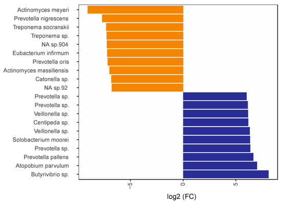 Most highly differentially abundant bacterial species in plaque compared to saliva samples. The graph demonstrates log2 Fold Change (FC) for the ten most enriched as well as the ten most depleted bacteria in plaque compared to saliva from patients with RA irrespective of periodontitis. Negative log2 FC indicates higher abundance in plaque samples (orange bars) and positive values indicate higher abundances in saliva samples (blue bars). NA, genome reference not available. The differences between the groups were analysed using DESeq2 []. *Adjusted p value < 0.05 was considered statistically significant.