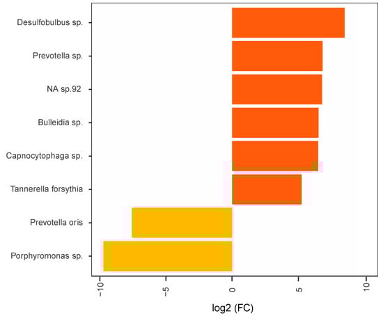 Most highly differentially abundant bacteria in plaque from patients with RA in relation to periodontitis severity. The graph demonstrates log2 Fold Change (FC) for the most highly enriched and depleted bacteria in plaque from RA patients with no/mild and moderate/severe periodontitis. Negative log2 FC indicate higher abundance in patients with no/mild periodontitis (light orange bars) and positive values indicate higher abundances in those with moderate/severe periodontitis (dark orange bars). NA, genome reference not available. The differences between the groups were analysed using DESeq2 []. *Adjusted p value < 0.05 was considered statistically significant.
