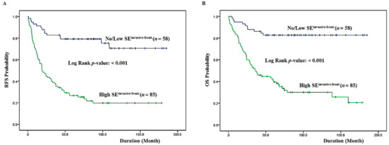 Kaplan–Meier survival analysis by SE expression status at the invasive front. (A) Cumulative RFS differences between patients with high and low SE expression. (B) Cumulative OS differences between patients with high and low SE expression. The p-value was obtained using the log-rank test of the differences. RFS: recurrence-free surviva; OS: overall survival.