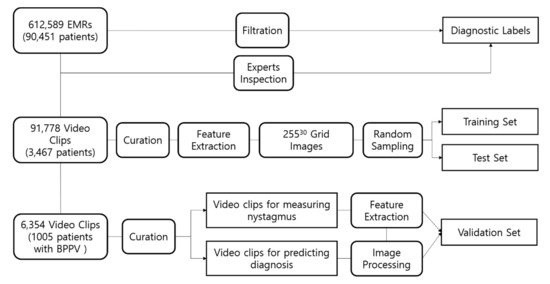 Data collection flow. Electronic medical records (EMRs) of 90,451 patients were filtered by keywords “vestibular function tests” and the video-clips recorded nystagmus were inspected by experts to obtain diagnostic labels for each patient. Among video-clips, those recorded nystagmus with typical movement on three axes were selected by experts and were used to create nystagmus directions for feature extraction (labels). Video clips of BPPV patients were used to generate the validation set for deep learning model. Grid images were randomly sampled using feature extraction, and the new set was split into training set and test set before training the model.