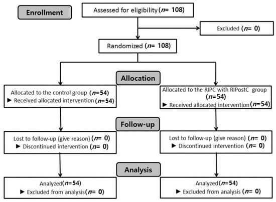 One hundred and eight patients were randomized and analyzed from March 2017 to July 2018 (Figure 1). Demographic data for the 108 patients enrolled in the study are shown in Table 1. Age, height, weight, body mass index, operation time, anesthetic time, duration of ICU stay, and postoperative MCA velocity were comparable between the two groups (Table 1). However, the duration of hospital stay was significantly shorter in the RIPC with RIPostC group than in the control group (17.8 (11.3) vs. 13.8 (5.9) days, p = 0.023) (Table 2).