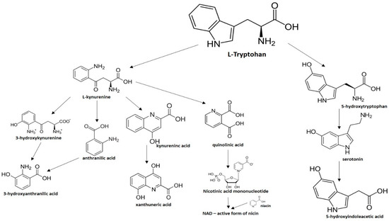 A study of the basic biology of the L-Tryp metabolism pointed out the relevant issue of the bioavailability of this amino acid or changes in the regulation of its metabolism in tissues. Therefore, studying the unbalanced transformation of this amino acid during the pathological stages of the organism is relevant. Serotonin synthesis occurs in the periphery within the gut neurons and enterochromaffin cells and in the central nervous system within the neurons of the raphe in the brain stem. L-Tryp is hydroxylated to 5-hydroxytryptophan (5-HTrp) by the enzyme tryptophan hydroxylase type 2, the rate limiting step in brain serotonin synthesis. Furthermore, decarboxylation, via the enzymatic action of the L-aromatic acid decarboxylase, occurred leading to the formation of 5-HT. 5-HT is further decomposed with monoamine oxidase type A (MAO-A) and aldehyde dehydrogenase to its main metabolite–5-HIAA [6,7,8].