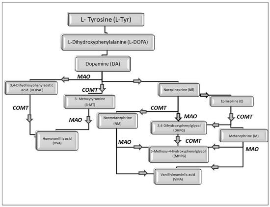 While studying the L-Tyrosine (L-Tyr) metabolic pathway, the compounds demonstrated in Figure 2 must be carefully discussed. L-Tyr is the relevant element of protein synthesis and serves as a precursor to catecholamines, tyramine⁄octopamine, melanin pigment and thyroid hormones. L-Tyr is synthesized from the essential amino acid phenylalanine via the action of the enzyme phenylalanine hydroxylase. Further transformation involves the hydroxylation of L-Tyr at the phenol ring by tyrosine hydroxylase to L-dihydroxyphenylalanine (L-DOPA) and its subsequent decarboxylation to DA by the aromatic amino acid decarboxylase. DA is an important neurotransmitter in the brain but a meaningful part of overall DA in the organism is produced by the mesenteric organ. DA is subsequently metabolized into several metabolites, like 3,4-dihydroxyphenylacetic acid (DOPAC) and homovanillic acid (HVA). DA is also the precursor of E and NE. All the compounds involved in the L-Tyr metabolic pathway except DA are chiral and only the L-enantiomers of the involved amino acids can lead to these important neuroactive molecules. Indeed, L-amino acids are the most abundant, naturally existing forms of those molecules in the human body [9]. Important but not yet widely studied, metabolites of the L-Tyr pathway are 3,4-dihydroxyphenylglycol (DHPG) and 3-methoxy-4-hydroxyphenylglycol (MHPG). DHPG is produced by the metabolism of NE by MAO and could be further transformed by catechol-O-methyltransferase (COMT) to MHPG. MHPG can also be formed by the deamination of normetanephrine (NM) and metanephrine (M). COMT also catalyses the methyl conjugation of DA and DOPAC, which results in the formation of 3-methoxytyramine (3-MT) and HVA, respectively. COMT allows the inactivation of the catecholamines and is the most important regulator of the prefrontal dopamine function. Further changes in MHPG lead to the formation of VMA, the principal end-product of NE and E metabolism. VMA is formed when MHPG is submitted to oxidation and catalysed by the sequential actions of alcohol and aldehyde dehydrogenases [10,11,12].