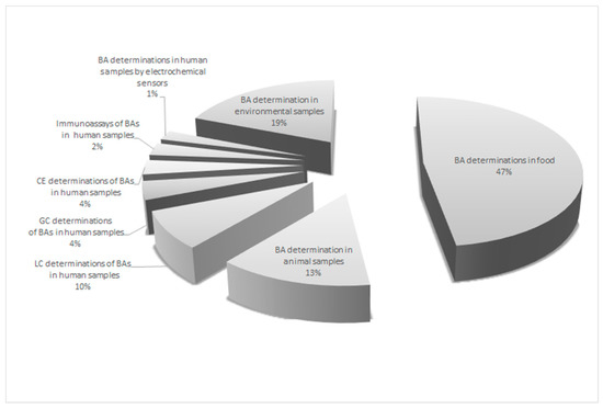 A lot of publications can be found in the literature related to the determination of BAs in food products, while less have focused on the development of methods for the analysis of the compounds of interest in biological matrices, including human specimens (Figure 3). The methodologies for BA identification and quantification in animal and human matrices, mainly based on liquid chromatography coupled with tandem mass spectrometry (LC-MS/MS) have been summarized in a few review papers [13,14,15]. On the other hand, no report comparing both LC-MS/MS, GC and CE techniques in respect of non-separation approaches, like immunoassay and electrochemical sensor techniques, was presented.