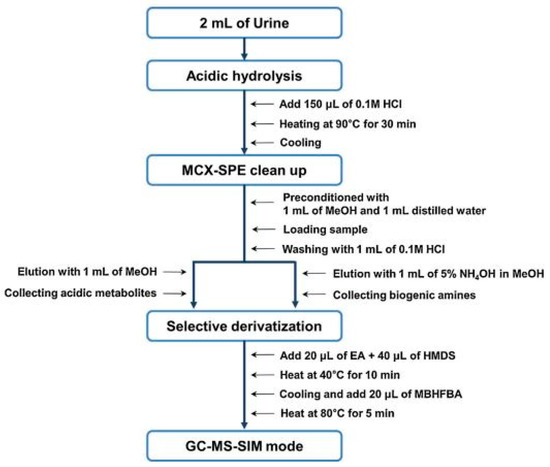 Overall analytical procedure for the analysis of biogenic amines and their acidic metabolites in urine by GC/MS in selective ion monitoring (SIM) mode. Figure adopted from reference [66] with the copyright permission.
