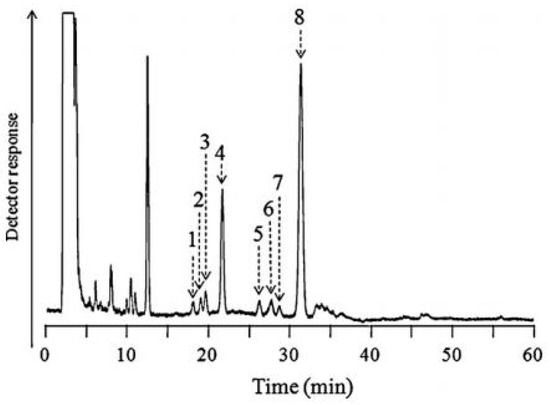 Therefore, pre-column or post-column chemical derivatizations have frequently been performed to increase the sensitivity and selectivity of BA determinations. The choice of pre-column or post-column derivatization mode is dependent on the equipment of the laboratory. Post-column derivatization requires additional instrumentation in the HPLC system, which can be omitted using pre-column derivatization. In each case, the optimization of the fluorescence reaction should be performed, which involves the selection of the optimal derivatizing agent and its concentration, the temperature and the reaction time. Due to the fact that these reactions can be long, automation of the fluorescence procedure is recommended. As it was earlier mentioned, the main chemical reagents for fluorescence derivatization of BAs include benzylamine, ethylenediamine or meso-1,2-diphenylethylenediamine (DPE), which react with BAs in the presence of potassium hexacyanoferrate (III), 2-(perfluorooctyl)ethyl isocyanate (PFOEI), as well as 4-(heptadecafluorodecyl)benzylamine (HFBA). Figure 5 presents representative chromatograms obtained by LC-FD for the quantification of eight BAs in urine after derivatization with the use of PFOEI and separation performed on a C18 stationary phase. This method allowed LODs to be obtained in the range of 0.21–4.2 nmol/mL [37].