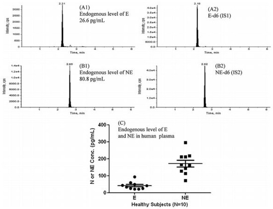 Representative LC-MS/MS chromatograms obtained while the monitoring of endogenous E and NE in the commercial healthy human plasma was carried out. (A1) 26.6 pg/mL of basal level of E in an individual human plasma, (A2) E-d6 (IS1), (B1) 80.8 pg/mL of basal level of NE in an individual human plasma. (B2) NE-d6 (IS2) and (C) the endogenous level of E and NE in 10 individual healthy human plasma samples. Figure adopted from reference [52] with the copyright permission.
