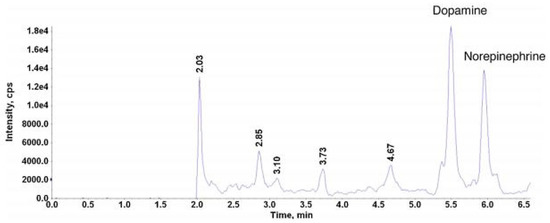 Since 2004, new generations of stationary phases compatible with LC systems have been introduced on the market under the name Ultra Performance Liquid Chromatography (UPLC). In UPLC systems, short columns with a small diameter of the particles (<2 µm) and the inner diameter of the column within 2.0–2.1 mm are applied. It allows a substantial reduction in the dwell volume from 1-2 mL to about 120 µL. In consequence, the analysis time can be significantly decreased without loss in efficiency. In comparison to the conventional HPLC methods, UPLC shows many advantages, including higher throughput, better resolution, higher sensitivity and less solvent consumption. However, UPLC systems require specially designed chromatographic instruments because of the column back pressure, which increases to 1200 bar. According to the literature, the UPLC-MS/MS analyses of BA profiles in human samples were commonly performed on C18 [7,54,77], although other stationary phases were also applied [28,43,64,68]. For example, the representative chromatogram obtained by the LC-MS/MS method carried out on a UPLC BEH C18 column (2.1 × 100 mm, 1.7 µm) for the quantification of DA in the presence of NE in human neonate plasma was shown in Figure 8. This method was able to determine the analyte with LOQ of 10 pg/mL [54].