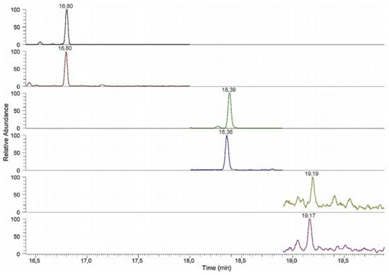 SPME-GC-QqQ-MS (SRM acquisition mode) chromatogram of a real urine sample from an healthy individual (retention times: 16.80 DA: 16.80 DA-d3; 18.39 5-HT: 18.36 5-HT-d4: 19.19 NE: 19.17 ME-d6). Figure adopted from reference [74] with the copyright permission.