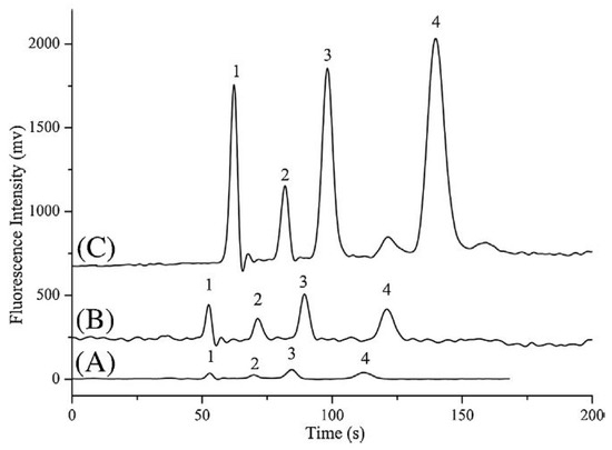 - Zhao, J.; Zhang, Q.; Yang, H.; Tu, Y. Electrophoretic separation of neurotransmitters on a polystyrene nano-sphere/polystyrene sulphonate coated poly(dimethylsiloxane) microchannel. Biomicrofluidics 2011, 5, 034104. [Google Scholar] [CrossRef] [PubMed]