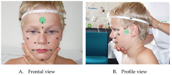 Standardized cranio-facial photographs with the camera lens aligned with the subject’s Frankfort horizontal plane and with an internal measure of scale (adhesive paper sticker) placed on the glabella landmark for the frontal view and on the condylion of the mandible for the profile view.