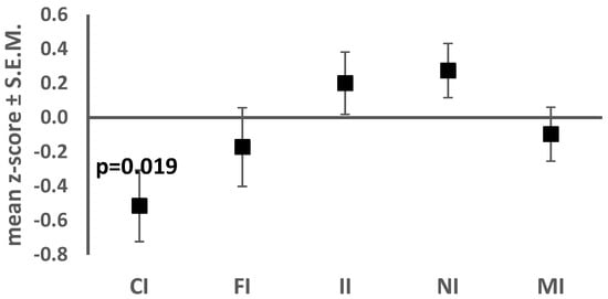 Anthropometric z-scores in the sample of 33 ASD patients (CI: Cephalic index, FI: Facial index, II: Interchantal index, NI: Nasal Index, MI: Mouth-face Index).