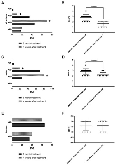 Bile duct proliferations after repeated oral dosing of rats with a Petasites hybridus extract (Petadolex) for six months and a recovery period of four weeks. Bile duct proliferations were dosage related with both sex. The grading of lesions ranges from minimal (G1), mild (G2), moderate (G3) to marked (G4). (A) Grading of bile duct proliferations of 40 high dose animals (dark column) and 20 recovery animals (grey patterned) treated for 6 month. Using the Fischer exact test, a statistically significant reduction from moderate (G3) to mild (G2) was calculated for animals which were allowed to recover from the treatment for four weeks (p = 0.0001). (B) The scores for male female animals after repeated treatment for six months are compared. Males are more sensitive to the treatment effects as determined by the Wilcoxon-Mann-Whitney-Test. (C) Grading of bile duct proliferations of 20 high dose males (dark column) and 10 male recovery animals (grey patterned) treated for six months. Using the Fischer exact test, a statistically significant reduction from moderate (G3) to mild (G2) was calculated for animals that were allowed to recover from the treatment for four weeks (p = 0.0161). (D) The scores for male animals after repeated treatment for six months and male recovery animals are compared. The grades of lesion differed significantly as determined by the Wilcoxon-Mann-Whitney-Test. (E) Grading of bile duct proliferations of 20 high dose females (dark column) and 10 female recovery animals (grey patterned) treated for six months. There was no difference between the groups, albeit the lesions are less pronounced when compared to males. (F) The scores for female animals after repeated treatment for six months and female recovery animals. There was no difference between the groups.
