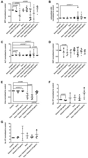 Effects of different Petasites hybridus extracts and Paracetamol on clinical liver function tests in cultures of human hepatocytes after daily treatment for 72 h. (A) MTT mitochondrial reductase activity. (B) LDH leakage/extracellular activity. (C) Alanine aminotransferase activity. (D) glutamyltransferase activity. (E) Urea production. (F,G) Testosterone 16 and 2 hydroxylation activity. The data of individual donors are given normalised to the DMSO vehicle control. The Petasites hybridus extracts A, B and C are specified to 37%, <1% and 19.1% petasin, respectively. Extract C is the marketed product Petadolex® and human hepatocyte cultures were treated at therapeutic Cmax (=60 ng/mL) and >49-fold therapeutic petasin Cmax (=15 µg/mL) concentrations. Hepatocyte cultures were also treated with Paracetamol at therapeutic Cmax (=Para; 20 µg/mL) concentrations and in combinations with different Petasites hybridus extracts. The data were analysed with the GraphPad Prism software version 6.05.