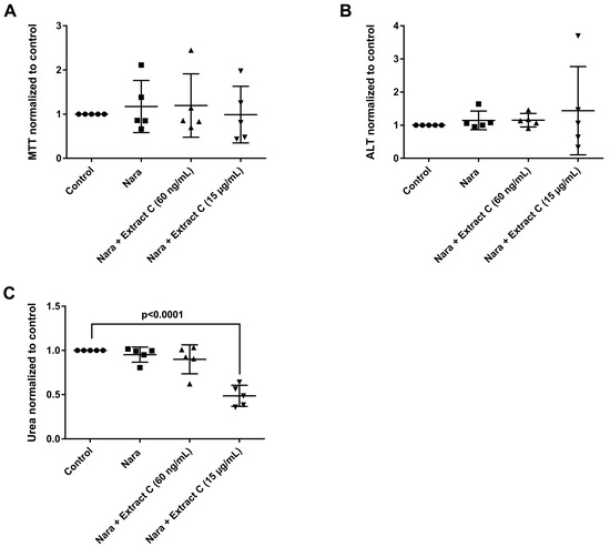 Likewise, treatment with Petadolex® and Naratriptan did not impair mitochondrial MTT activity at therapeutic Cmax concentrations. However, MTT activities were markedly reduced with two donors at >49-fold Cmax petasin and Naratriptan therapeutic concentrations. One donor presented marked reduction in mitochondrial MTT activity and a small increase in ALT as well as reduced urea measurements at therapeutic Naratriptan concentrations (Figure 5A) to indicate hepatotoxicity (Figure 5). At >49-fold Cmax petasin and therapeutic Naratriptan concentrations, MTT activity and urea production was reduced (Figure 5A,C); here, one donor presented a nearly four-fold increase in ALT activity (Figure 5B).
