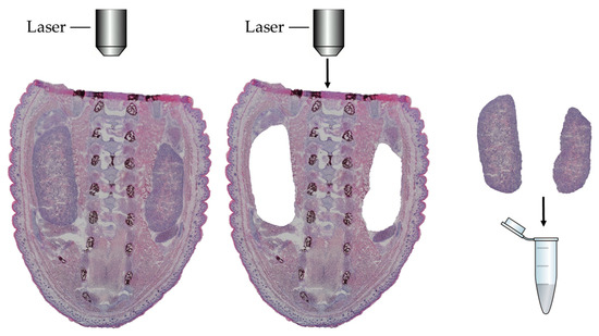 A slide with air-dried sections was inserted in the slide holder of the LCM microscope (LMD7000, Leica Microsystems; Leica, Wetzlar, Germany; power 16, aperture 20, velocity 7), and a 200 µL PCR-tube was placed in such a way underneath the sections that dissected pieces fell directly into the tube cap. Approximately 12 mm2 of kidney were collected per embryo (Figure 1). Consecutively, the tubes were removed from the holder, and the contents were carefully centrifuged to the bottom of the tube before 50 µL of 10% SDS in PBS buffer was added. Tubes were stored at −20 °C for one night before the protein was extracted.