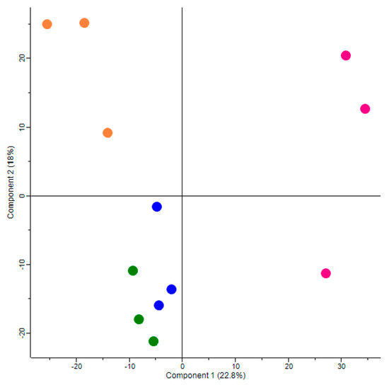 Principal component analysis. Orange dots, HFD group; pink dots, SD group; blue dots, HFD-M group; green dots, SD-M group.