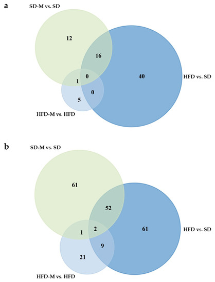 (a) Venn diagram to visualize number of overlaps of significantly (q < 0.05) and relevantly (fold change ≥1.5) altered proteins of the comparisons SD-M vs. SD (i.e., number of renal proteins altered by metformin in fetuses of dams fed a standard diet), HFD vs. SD (i.e., number of renal proteins altered by high fat diet) and HFD-M vs. HFD (i.e., number of renal proteins altered by metformin in fetuses of dams fed a high fat diet); (b) Venn diagram to visualize number of overlaps of considerably (q < 0.1) and relevantly (fold change ≥1.5) altered proteins of the same comparisons.