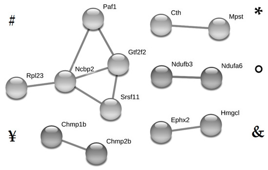 String analysis identified five clusters of potentially interacting proteins (Figure 4). The most prominent cluster of interacting proteins included proteins involved in processes of transcription/translation (RPL23, NCBP2, SRSF11, GTF2F2 and PAF1). Further predicted interactions were related to eicosanoid metabolism (EPHX2 and HMGCL), hydrogen sulfide H(2)S- synthesis (MPST and CTH), the respiratory chain of the mitochondrial membrane (NDUFB3, NDUFA6) and membrane remodeling (CHMP1B and CHMP2B). Uniprot Keywords identified were “acetylation” (24 proteins), “phosphoprotein” (35 proteins) and “mitochondrion” (12 proteins). The only biological process identified was “regulation of primary metabolic process” (29 proteins).