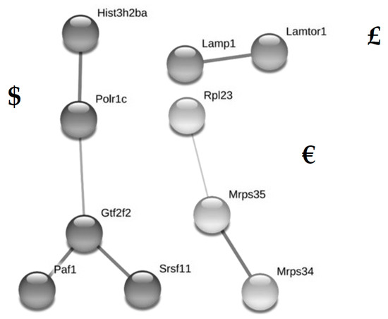 String analysis identified three clusters of potentially interacting proteins (Figure 5). The biggest cluster consisted of proteins related to transcription (HIST3H2BA, POLR1C, PAF1, SRSF11, GTF2F2); the second cluster of proteins was related to translation (RPL23, MRPS35, MRPS34); and the third interaction was shown for LAMP1 and LAMTOR1. Functional enrichment analysis of biological processes and Uniprot keywords yielded no results.