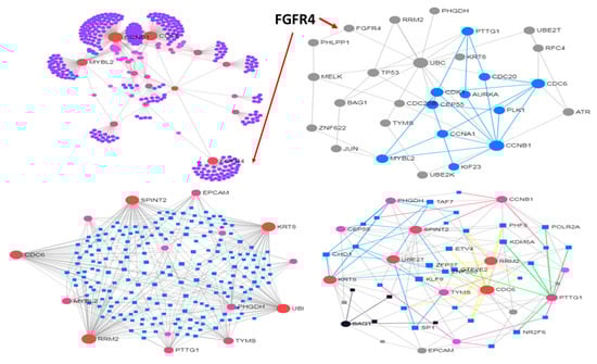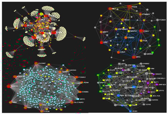 Protein Interaction Networks (PIN) from 16 metastatic over-expressed genes in BC. Top panel: Left, whole network; Right, modular map of reduced sub-network. Bottom panel: left, whole TF-gene network; Right, modular map of reduced sub-network.