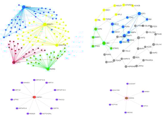 This study was on 21 metastatic samples and 11 non-metastatic samples of stomach adenocarcinoma, and 2979 DEGs were obtained in the first group and 491 in the second group [84]. In the first DEG profile, 1251 were over-expressed genes and 1728 were under-expressed genes, with 2593 genes tissue-specific. Other 386 DEGs appeared in both groups showing similar expression patterns. Here, the top-50 DEGs in this minor sub-profile were used to build a network (Figure 3, top panel). We can see that, despite the lack of differentiation, these gene sub-profile reveals modular structure at both large and small scale, i.e., after suitable network reduction (42 nodes and 58 edges).