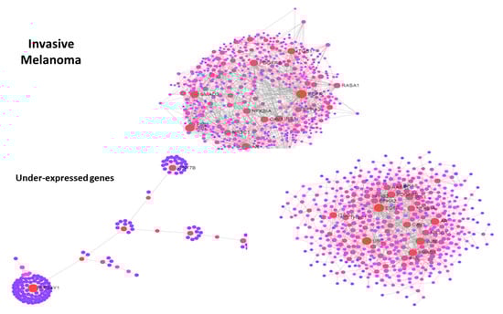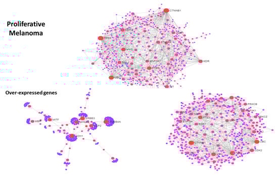 Figure 4 and Figure 5 show protein-protein interaction networks obtained from two melanoma signatures, proliferative genes (over-expressed) and invasive genes (under-expressed), respectively. Reduced networks were obtained from the top-150 over-expressed (proliferative DEGs) and the top-150 under-expressed (invasive DEGs) values. The two global signature networks are dense and present key hubs, namely PDGFRB, ITGB1, EGFR, NFKBIA, JUN in invasive, and CDK2, STAT5A, TP53, MYC, BCL2, PTEN, MAP3K1, KDR, KIT in proliferative, and many communities were found. To understand the origin of modularity, a split was operated between the top-150 DEGs in both signatures and the rest of DEG values, and their networks were plotted. In both signatures, particularly in the proliferative one, the contribution to modularity of the top DEGs is evident compared to the other DEG values, indicating that the strongest signals drive the interaction dynamics modularly especially with proliferative genes. This transition between proliferative and invasive cells is a sign of disease progression that connects metastasis to the presence of community structure.