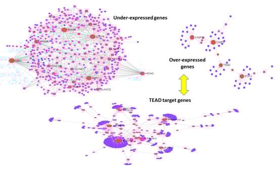 From the data obtained with 123 paired primary and metastatic tissues in breast cancer patients [80], the networks displayed in Figure 1 and Figure 2 were built. Overall, 47 genes (16/31 genes significantly over/under-expressed) were found differentially expressed in the metastatic cases. The protein-protein interaction networks (source STRING db, and confidence level fixed at relatively high threshold, namely 0.7) are shown for the over-expressed DEG proteins (375 nodes and 476 edges) and for the under-expressed DEG proteins (772 nodes and 1113 edges). Due to network size, the minimum connected (reduced) network configurations are also computed (28 nodes and 52 edges, and 53 nodes and 141 edges, respectively).