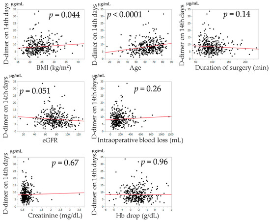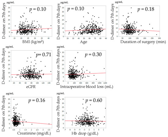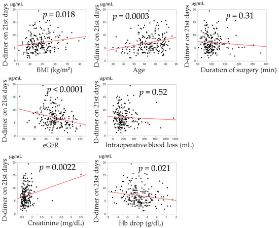 The relationships between postoperative D-dimer levels and age, BMI, duration of surgery, intraoperative blood loss, change in Hb from the preoperative examination, creatinine value, and eGFR examined by univariate regression analysis are shown in Figure 2, Figure 3 and Figure 4. Univariate regression analysis showed that no factors were significantly associated with D-dimer values at postoperative day 7. Higher D-dimer levels at postoperative day 14 were significantly correlated with an older age (p < 0.0001). Higher D-dimer levels at postoperative day 21 were significantly correlated with a higher BMI (p = 0.018), higher age (p = 0.0003), higher creatinine level (p = 0.0022), lower eGFR (p < 0.0001), and change in Hb (p = 0.021).