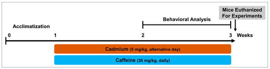 Schematic diagram of experimental design showing duration of cadmium (as cadmium chloride) and/or caffeine treatment in adult mice and their behavioral analysis.