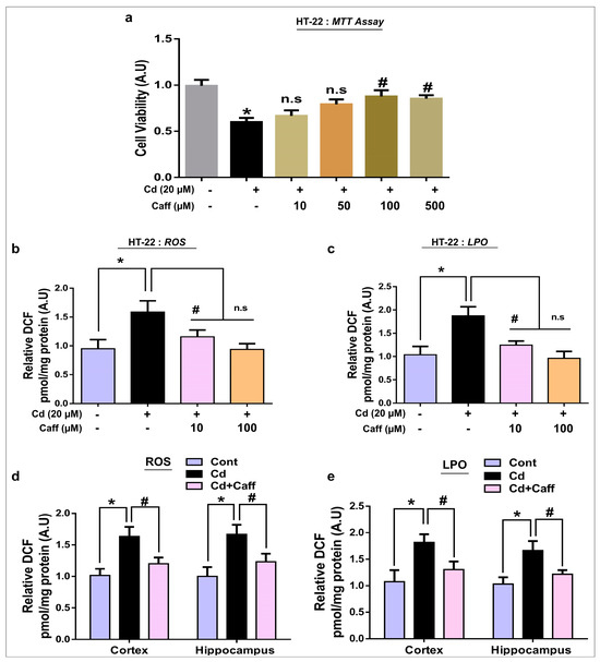 First, we evaluated the effects of different concentrations of caffeine against Cd on cell viability via MTT assay performed on HT-22 cells. The result demonstrated that 20 µM Cd significantly reduced cell viability, and 100 µM caffeine markedly reduced Cd-induced cell toxicity in HT-22 cells (Figure 2a). Next, we performed ROS and LPO assays in vitro on HT-22 cells. Our findings revealed that there was enhanced expression of ROS and LPO in the Cd-alone treated cells compared to the vehicle-treated control group. Interestingly, ROS and LPO levels were significantly downregulated in the Cd + caffeine-treated cells (Figure 2b,c). To confirm these findings in vivo, we examined the detrimental effects of Cd in adult mouse brain (cortex and hippocampus). Interestingly, we found that ROS/LPO levels were significantly elevated in the Cd-alone treated group compared to the vehicle-treated control group. However, ROS/LPO levels were markedly downregulated in the Cd + caffeine-treated group (Figure 2d,e). Overall, the in vivo and in vitro findings support the notion that caffeine reverses the detrimental effects of Cd.