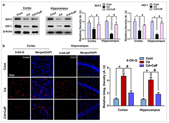 Extensive studies have reported that Cd is responsible for elevated oxidative stress and neurodegeneration. Nrf-2 plays a protective role against ROS and is also known to detoxify free radicals in the mouse brain. Nrf-2 regulates the expression of HO-1, which has a protective role against oxidative stress and neurodegeneration. To assess the effects of Cd on the expression of Nrf-2 and HO-1, we performed Western blot analysis, which revealed that their expression was significantly downregulated by Cd in the adult mouse brain, and was significantly upregulated in the Cd + caffeine-treated group (Figure 3a). Another main marker used to evaluate oxidative stress, 8-dihydro-8-oxoguanine (8-OXO-G), was assessed in the experimental groups through confocal microscopy. The results revealed that the level of 8-OXO-G was significantly enhanced in the Cd-alone treated group compared to the vehicle-treated control group. Remarkably, the level was significantly downregulated by caffeine (Figure 3b).