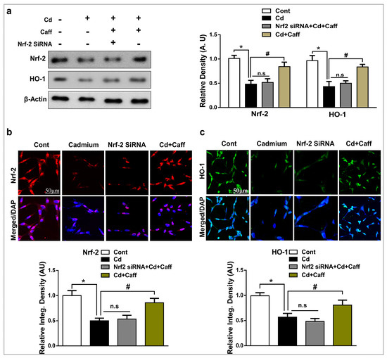 We further examined the expression of Nrf-2 and HO-1 in vitro by immunoblot and immunofluorescence microscopy to support our in vivo findings. Our results show that Cd treatment significantly reduced the expression of Nrf-2 and its target gene HO-1 in HT-22 cells. On the other hand, the expression of Nrf-2 and HO-1 was significantly restored in the Cd + caffeine-treated group. However, the expression of Nrf-2 and HO-1 was not significantly improved when Nrf-2 genes had been knocked down by Nrf-2 siRNA (Figure 4a,b). Overall, the above findings support the hypothesis that caffeine exerts protective effects against Cd-induced oxidative stress by regulating the Nrf-2/HO-1 signaling pathway.