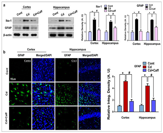 Previous studies have reported that oxidative stress is responsible for the activation of glial cells, which leads to neuroinflammation [35,36]. Ionized calcium-binding adaptor molecule 1(Iba-1) and glial fibrillary acidic protein (GFAP) are the specific markers for activated microglia and astrocytes, respectively. Our Western blot results indicated that Cd-injected mice showed enhanced expression of Iba-1 and GFAP in the cortical and hippocampal regions compared to the control vehicle-treated group (Figure 5a). However, the expression of Iba-1 and GFAP in the Cd + caffeine-treated mice was significantly downregulated compared to the Cd-alone treated mice. Similarly, immunofluorescence revealed that Cd significantly enhanced the immunoreactivity of GFAP compared to the control group, which was significantly downregulated in the Cd + caffeine-treated group compared to the Cd-alone group. (Figure 5b). Overall these results show that caffeine may inhibit the activation of astrocytes and microglia in Cd-treated mice, which may contribute to its anti-inflammatory potential.