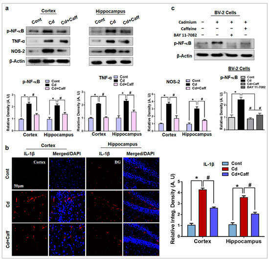 It has been reported that Cd is responsible for the activation of several inflammatory markers such as phosphorylated-nuclear factor-κB (p-NF-κB), tumor necrosis factor alpha (TNF-α), nitric oxide synthase type 2 (NOS-2), and interleukin-1β (IL1-β) [37,38]. So, here, we evaluated the expression of p-NF-κB, TNF-α, and NOS-2 in the adult mouse cortex and hippocampus of the experimental groups, which showed Cd-induced upregulation of all three compared to vehicle-treated control mice. Interestingly, the expression of these activated cytokines was significantly downregulated in the Cd + caffeine-treated group compared to the Cd-alone group (Figure 6a). Moreover, we confirmed these findings in vitro in BV-2 cells, which revealed that Cd augmented the p-NF-κB protein level, while caffeine and BAY 11-7082 (an NF-κB inhibitor) reduced this level significantly (Figure 6c). This result supports the hypothesis that the anti-inflammatory effects of caffeine against Cd are mediated via the NF-κB signaling pathway. Similarly, the immunofluorescence results of IL-1β also indicated that Cd administration increased IL-1β immunoreactivity compared to the control group. On the other hand, caffeine significantly downregulated Cd-induced immunoreactivity of IL-1β as compared to the Cd-alone group (Figure 6b). Overall, these results support the hypothesis that caffeine attenuated the Cd-induced release of inflammatory cytokines via NF-κB and thereby rescued the mouse brain against Cd-induced neurodegeneration.