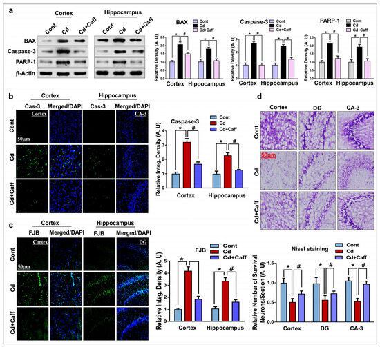 Previous studies have demonstrated that Cd-induced oxidative stress activates various neuronal apoptotic proteins, which ultimately leads to neuronal cells death [59,60]. During apoptosis, Bax translocates from the cytosol to mitochondria, which activate mitochondrial-dependent apoptosis, followed by cytochrome-c release, mitochondrial dysfunction, and caspase activation, which ultimately leads to cell death [61,62,63]. Caspase-3 is recognized as an important feature of apoptosis in neuronal cells. Activation of caspase-3 results in neuronal cell death and is also a main feature of neurodegenerative disease [64,65,66]. Activated caspase-3 cleaves poly (ADP-ribose) polymerase-1 (PARP-1), which acts against the repair of damaged DNA and results in energy deprivation of cells, ultimately leading to apoptotic cell death [67,68,69]. The present study also demonstrates that Cd significantly enhanced Bax, caspase-3, and PARP-1 levels, while caffeine significantly reduced their levels. Also, FJB staining, a histological analysis used for degenerative neurons [70], demonstrates that caffeine significantly attenuated the detrimental effects of Cd by reducing the number of FJB-stained neurons in the hippocampus and cortex. Nissl staining result also support the finding that caffeine significantly enhanced the survival of neurons (Figure 7a–d).