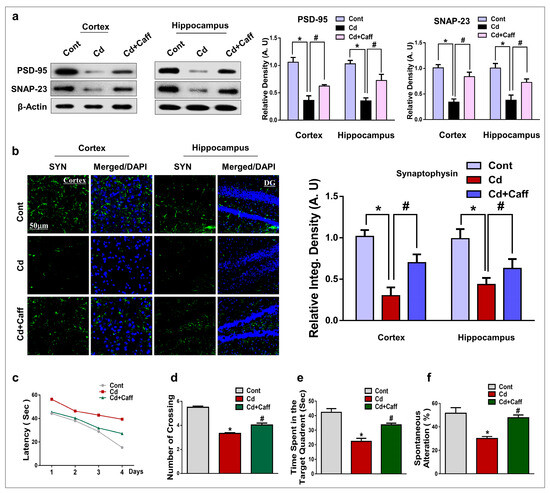 Chronic exposure to Cd interferes with synaptic transmission and synaptic plasticity, which leads to neurological disorders such as olfactory dysfunction and Parkinson’s disease [71]. We also found that Cd markedly reduced the expression of synaptic proteins (PSD-95, SNAP-23, and SYN) in the cortex and hippocampus of Cd-treated mice, and administration of caffeine significantly enhanced its expression. Furthermore, studies have reported that Cd is neurotoxic and exposure to Cd is responsible for impaired cognition and memory in several animal models [72,73]. We performed behavioral analysis (MWM and Y-Maze) to measure spatial learning and memory function. Our results show that Cd is responsible for a significant reduction in spatial cognition and memory functions. Administration of caffeine significantly improved memory functions (Figure 8).