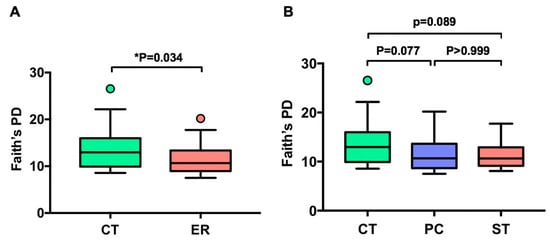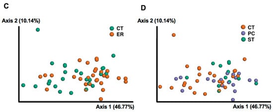 To investigate whether RA is associated with altered microbial diversity, we sequenced fecal samples from 25 healthy subjects and 29 early RA female patients (Table 1) and analyzed the data using qiime2-2018.11. After filtering, merging and removing chimera and PhiX sequences, 543,259 reads were clustered into OTUs based on 97% sequence similarity, with a mean of 10,060 reads across the 54 samples. The phylogenetic diversity of the gut microbiota of ER patients was significantly different from that of healthy subjects (p < 0.05 for Faith’s phylogenetic diversity (PD), Figure 1A). However, when ER patients were subdivided into two patient groups with PC and ST, there were no differences between PC and ST patients (p > 0.999 for Faith’s PD, Figure 1B). Shannon diversity index, which reflects both evenness and richness, presented a similar declining trend in terms of phylogenetic differences between different ER patients but this was not significant (p = 0.157, Figure S1A,B). The richness of the gut microbiota of ER patients was not significantly different from that of the CT group (p = 0.1547, Figure S1C,D). Weighted UniFrac distance-based microbiota structure analysis revealed significant differences in microbial community between ER patients and healthy subjects (p = 0.008, PERMANOVA, Figure 1C). The community in the PC patients’ microbiota was similar to that in ST patients (p = 0.723, PERMANOVA, Figure 1D), and both the PC and ST groups differed from healthy subjects (p = 0.0249 and p = 0.040, PERMANOVA, Figure 1D).