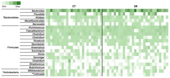 Heat map of the 20 most abundant genera in each sample. The color intensity in each cell indicates the proportion of a given genus in a sample. Significantly abundant taxa in either of the two groups (* p < 0.05, Wilcoxon rank-sum test; ** p < 0.01, Wilcoxon rank-sum test) are included.