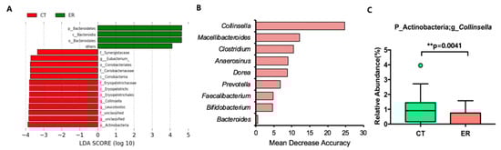 Featured taxa based on LDA effect size (LEfSe) analysis and random forest predictive analysis of CT and ER groups. (A) Selected taxa based on LEfSe analysis. (B) Selected taxa based on random forest analysis of the top 20 abundant genera. (C) Relative abundance of the genus Collinsella.
