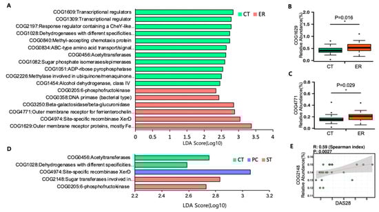 Featured COGs by PICRUSt. (A) Differentially abundant COGs between ER and CT groups based on LEfSe analysis. (B,C) The relative abundance of COG1629 and 4771. (D) Differentially abundant COGs among CT, PC, and ST groups based on LEfSe analysis. (E) Spearman correlation analysis of COG2148 and DAS28.