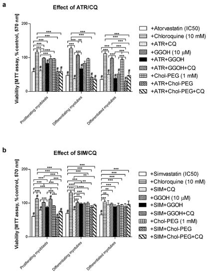 Effect of geranylgeraniol (GGOH, 10 µM) on cell viability (MTT assay) affected by mevalonate (MEV) pathway modulators (atorvastatin—ATR, simvastatin—SIM) or water-soluble cholesterol (Chol-PEG) in the presence or absence of chloroquine (CQ, 10 mM). Differentiating C2C12 myoblasts were exposed for 24, 72, or 120 h to statins (IC50) or water-soluble cholesterol (Chol-PEG), (Day 1—proliferating myoblasts; Day 3—differentiating myotubes; Day 5—differentiated myotubes). (a) ATR diminished fraction of viable cells (IC50). Neither CQ nor Chol-PEG or GGOH affected cell viability in comparison to control untreated cells (p > 0.05); GGOH but not Chol-PEG improved cell viability that had been reduced by ATR in proliferating myoblasts (p < 0.001). The effect of GGOH was not affected by CQ administration (p > 0.05); (b) SIM diminished the fraction of viable cells (IC50). Neither CQ nor water-soluble cholesterol (Chol-PEG) affected cell viability in comparison to control untreated cells (p > 0.05); GGOH but not Chol-PEG recovered cell viability reduced by SIM in proliferating myoblasts, differentiating and differentiated myotubes (p < 0.001). The effect of GGOH was not affected by CQ administration (p > 0.05); ** p < 0.01, *** p < 0.001, for comparison between the means. Statistically significant differences from untreated control cells are marked by # (at least at the level of p < 0.05). The results are indicative of three independent experiments performed in eight replicates.
