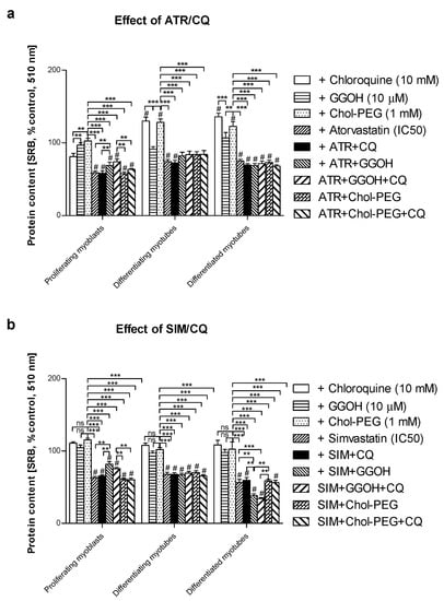 Effect of geranylgeraniol (GGOH, µ10 M) on the protein content (sulforhodamine B (SRB) incorporation) affected by MEV pathway modulators (atorvastatin—ATR, simvastatin—SIM) or water-soluble cholesterol (Chol-PEG) in the presence or absence of chloroquine (CQ, 10 mM). Differentiating C2C12 myoblasts were exposed for 24, 72 or 120 h to statins (IC50) or water-soluble cholesterol (Chol-PEG), (Day 1—proliferating myoblasts; Day 3—differentiating myotubes; Day 5—differentiated myotubes). (a) ATR diminished the protein content in viable cells (IC50). Neither CQ nor Chol-PEG or GGOH affected the protein content in comparison to control untreated cells (p > 0.05); GGOH but not Chol-PEG recovered cellular protein content reduced by ATR in proliferating myoblasts (p < 0.001). The effect of GGOH was not affected by CQ administration (p > 0.05); (b) SIM diminished the protein content in viable cells (IC50). Neither CQ nor Chol-PEG or GGOH affected the protein content in comparison to control untreated cells (p > 0.05); GGOH but not Chol-PEG recovered the cellular protein content reduced by SIM in proliferating myoblasts (p < 0.001). GGOH worsened the protein content that had been diminished by SIM in differentiated myotubes (p < 0.01). The effect of GGOH was not affected by CQ administration (p > 0.05); *** p < 0.001, for comparison between the means. Statistically significant differences from untreated control cells are marked by # (at least at the level of p < 0.05, ns—non significant). The results are indicative of three independent experiments performed in eight replicates.