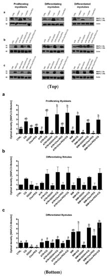 Top. Autophagy flux. Western blots of MAPLC-Ib/IIb with regard to actin. Effect of geranylgeraniol (GGOH, 10 µM) on the protein expression levels affected by MEV pathway modulators (atorvastatin—ATR, simvastatin—SIM) or water-soluble cholesterol (Chol-PEG) in the presence or absence of chloroquine (CQ, 10 mM). (a) In untreated myoblasts, the expression levels of MAPLC3-Ib/IIb protein increased accordingly with the differentiation stage. MAPLC3-Ib/IIb expression levels increased considerably upon CQ treatment. (b) ATR markedly reduced MAPLC3-Ib/IIb protein expression levels in proliferating myoblasts but differentiating and differentiated myotubes. Irrespective of co-treatment, CQ administration elevated MAPLC3-Ib/IIb protein expression levels equally, with no differences observed between the treatments. (c) SIM markedly reduced MAPLC3-Ib/IIb protein expression levels in proliferating myoblasts but not differentiating and differentiated myotubes. Irrespective of co-treatment, CQ administration elevated MAPLC3-Ib/IIb protein expression levels equally, with no differences observed between the treatments. Representative blots. The results are indicative of three independent experiments. Bottom. Autophagy flux. Densitometry analysis of MAPL3-IIb protein expression levels calculated in relation to house-keeping protein (actin). The effect of non-sterol isoprenoid, GGOH, and soluble cholesterol treatments on MAP LC3-IIb in C2C12 myoblasts affected by statins (atorvastatin—ATR; simvastatin—SIM) or water-soluble cholesterol (Chol-PEG). Differentiating C2C12 myoblasts exposed for 24, 72, or 120 h to statins (IC50), (Day 1—proliferating myoblasts; Day 3—differentiating myotubes; Day 5—differentiated myotubes). Different small letters indicate statistical significance (p < 0.05), whereas different capital letters represent values with high statistically significant (p < 0.01) differences between the means, respectively. The results are indicative of three independent experiments.
