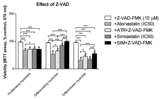 Effect of pan-caspase inhibitor Z-VAD-FMK on the cell viability (MTT assay) affected by MEV pathway modulators (atorvastatin—ATR, simvastatin—SIM). Differentiating C2C12 myoblasts were exposed for 24, 72, or 120 h to statins (IC50), (Day 1—proliferating myoblasts; Day 3—differentiating myotubes; Day 5—differentiated myotubes). ATR diminished the fraction of viable cells (IC50). Z-VAD-FMK itself did not affect cell viability, moreover, it could not recover ATR- or SIM-treated proliferating myoblasts (p > 0.05), but it significantly increased viable differentiating and differentiated myotubes treated with ATR or SIM (p < 0.05 and p < 0.001, respectively). * p < 0.05, *** p < 0.001, for comparison between the means. Statistically significant differences for untreated control cells are marked by # (at least at the level of p < 0.05). The results are indicative of three independent experiments performed in eight replicates.